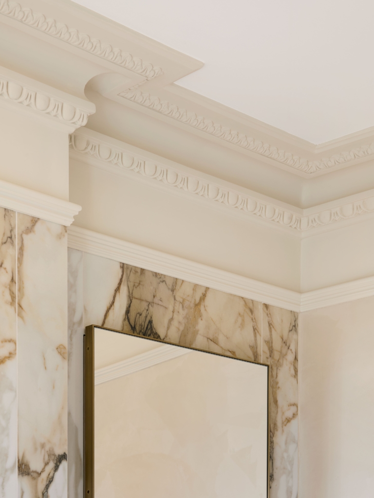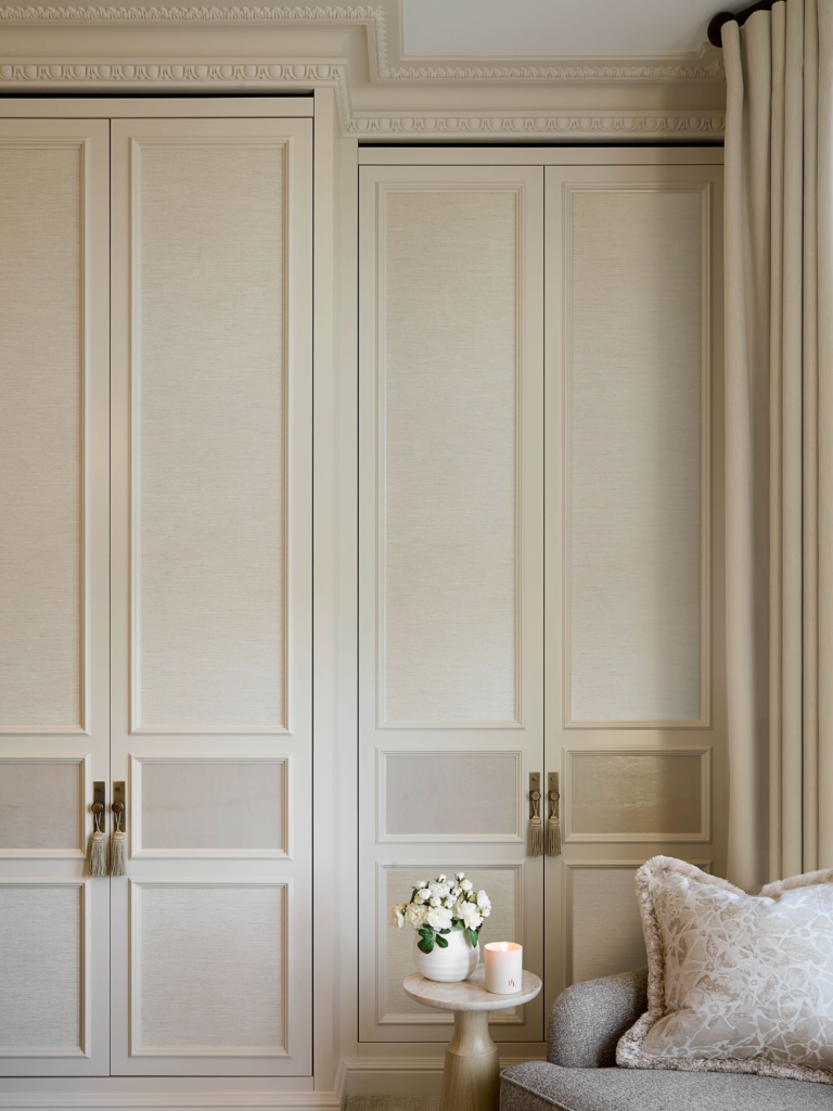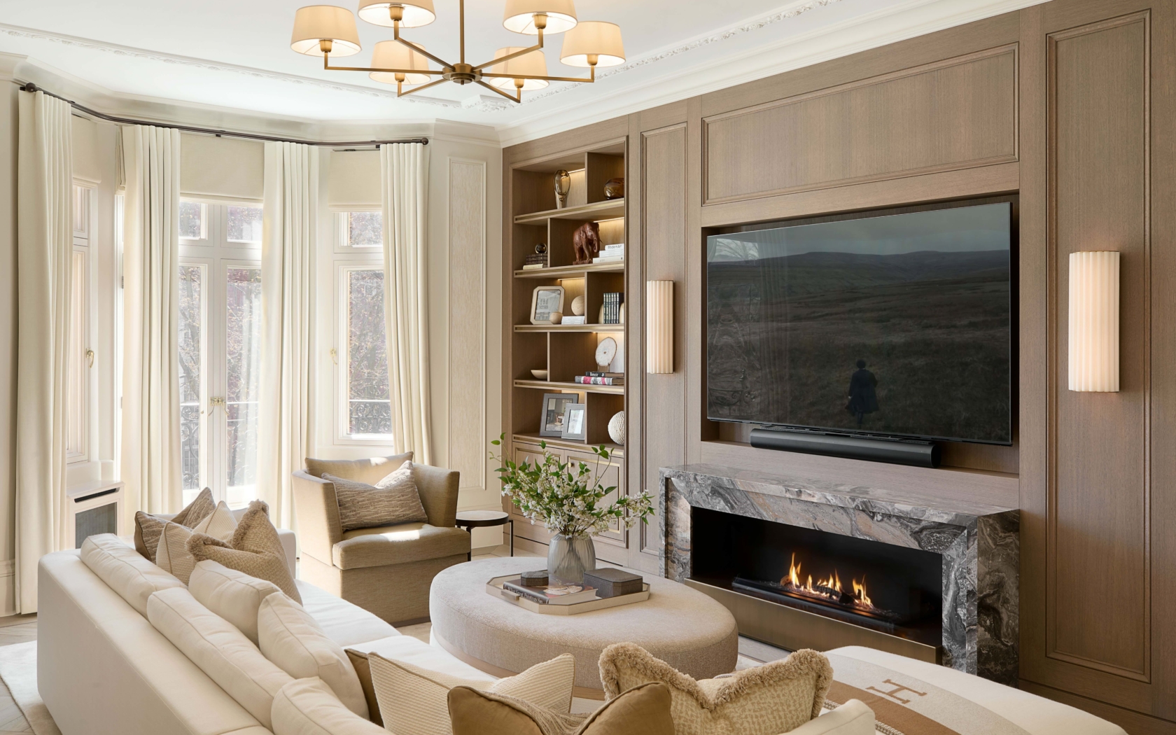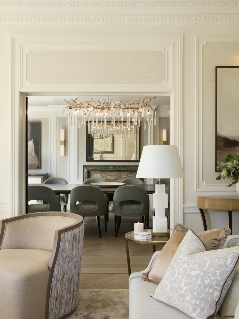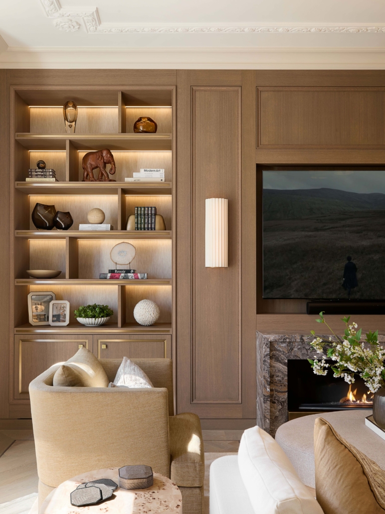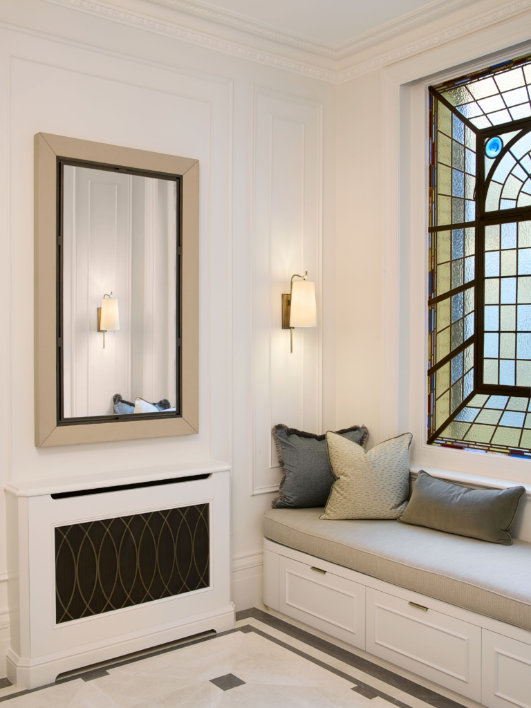Located in the heart of Marylebone, this classical apartment was a very special restoration project to work on. Built in 1904 and set within a landmarked mansion building, it showcases elegant Edwardian features, characterised by their elegance and detail. These included beautiful bay windows, original French doors, ornate decorative floor tiles, intricate stained glass windows, timber panelling and large rooms with high ceilings. It was a joy to design to such striking proportions and craft a scheme which enhanced and honoured it’s charming features. While the meticulous restoration of its original features was a very important part of the client brief, the clients also wanted a sense of clean modernity woven throughout the home. We introduced this style particularly in the less formal areas- such as the media room and children’s bedrooms- with the use of lighter finishes, modern fabric prints and contemporary silhouettes seamlessly layered onto the classical architectural base. The result is the harmonious marriage of old and new to create an elegant, considered and welcoming family home.