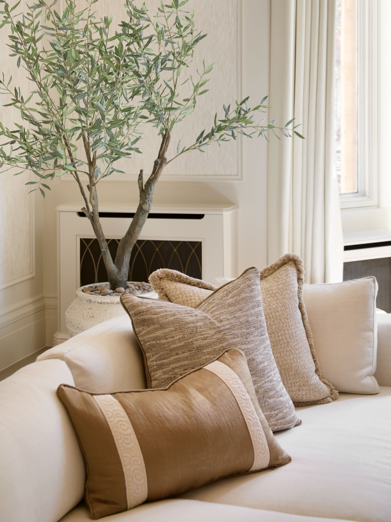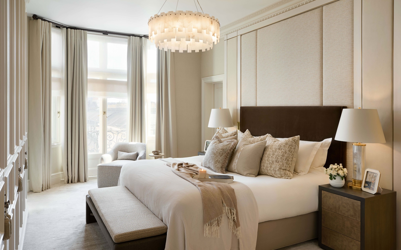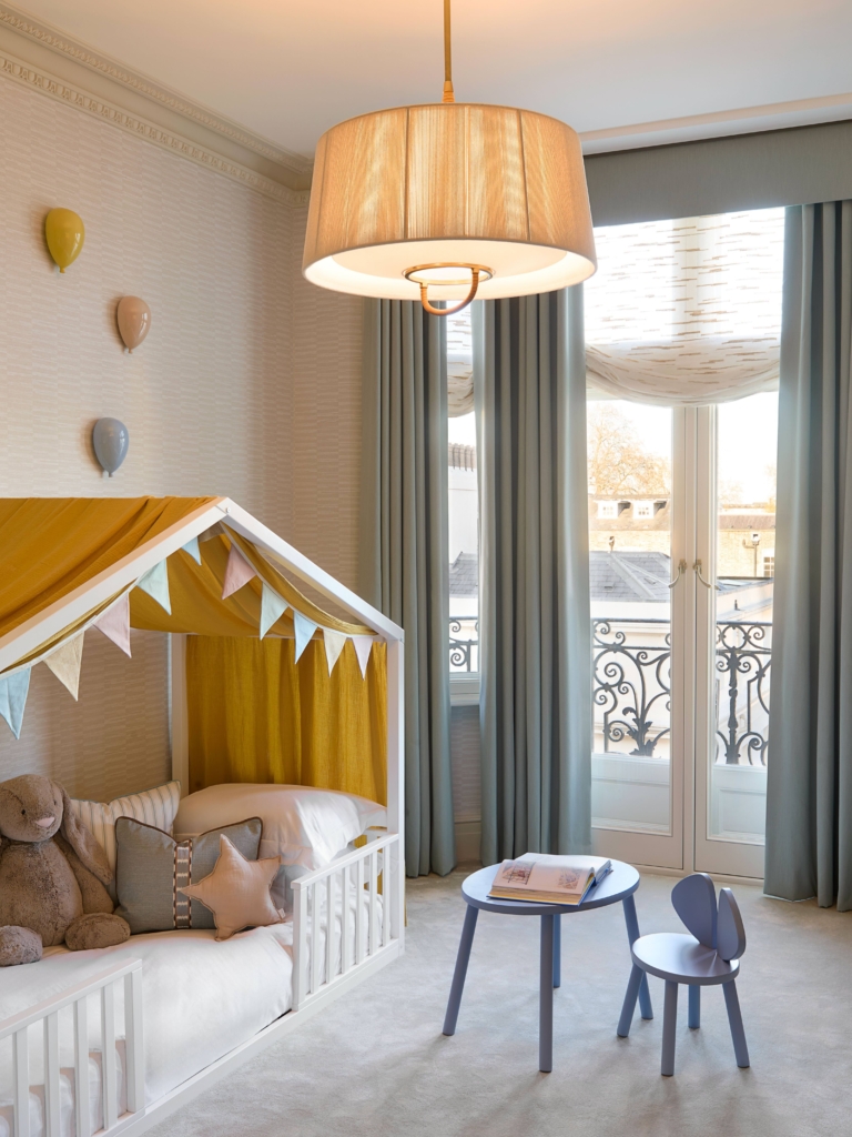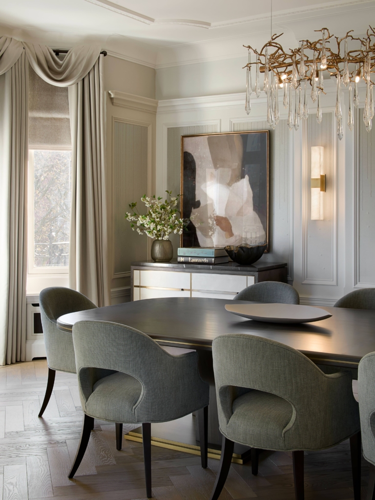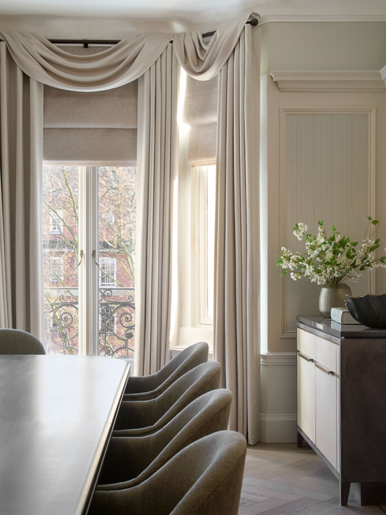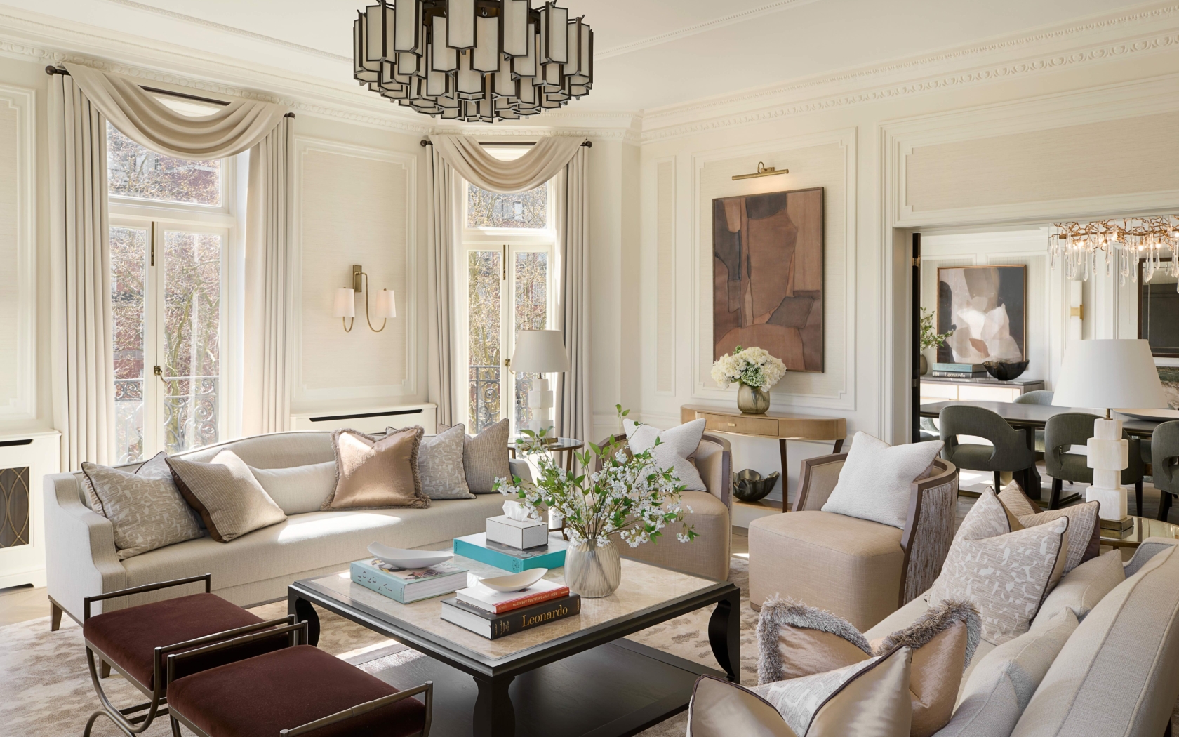 Located in the heart of Marylebone, this classical apartment was a very special restoration project to work on. Built in 1904 and set within a landmarked mansion building, it showcases elegant Edwardian features, characterised by their elegance and detail. These included beautiful bay windows, original French doors, ornate decorative floor tiles, intricate stained glass windows, timber panelling and large rooms with high ceilings. It was a joy to design to such striking proportions and craft a scheme which enhanced and honoured it’s charming features. While the meticulous restoration of its original features was a very important part of the client brief, the clients also wanted a sense of clean modernity woven throughout the home. We introduced this style particularly in the less formal areas- such as the media room and children’s bedrooms- with the use of lighter finishes, modern fabric prints and contemporary silhouettes seamlessly layered onto the classical architectural base. The result is the harmonious marriage of old and new to create an elegant, considered and welcoming family home.