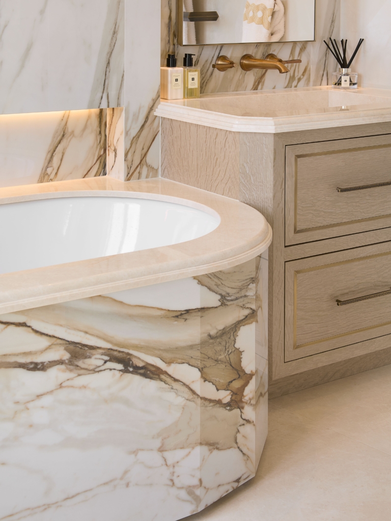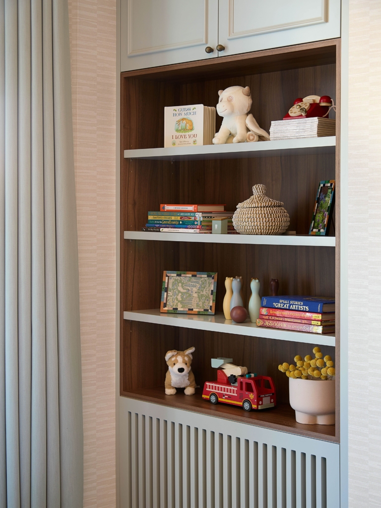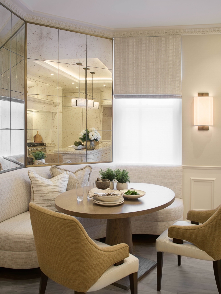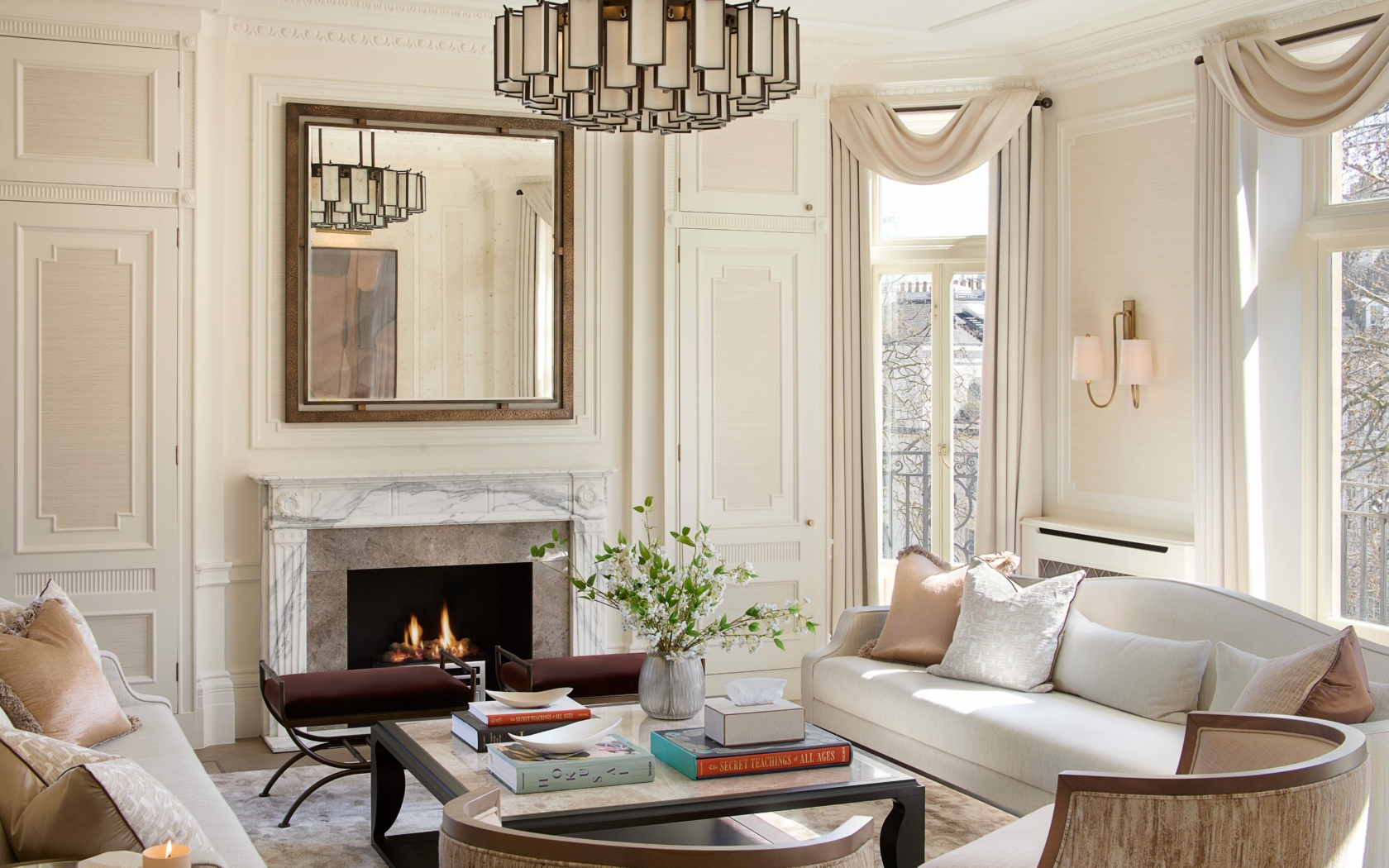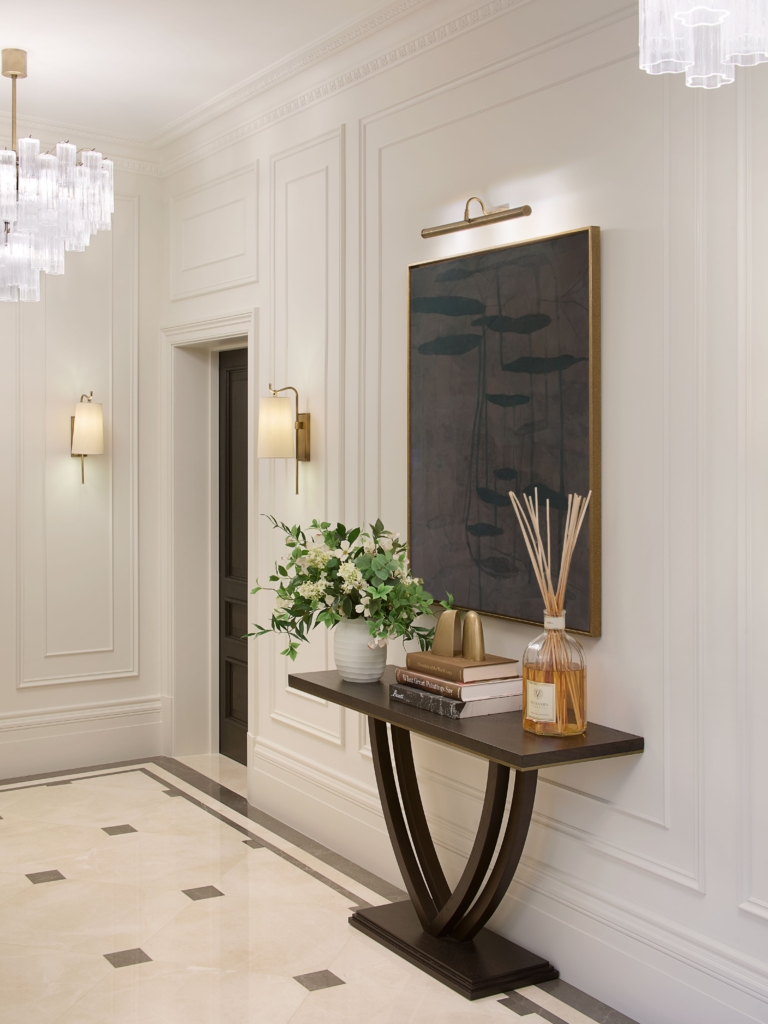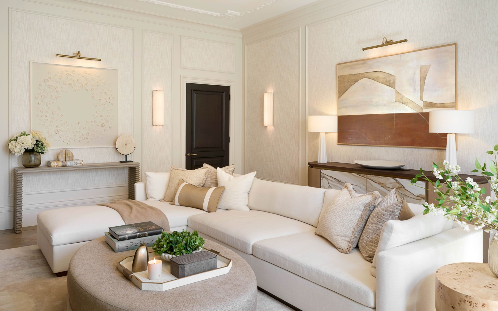 Located in the heart of Marylebone, this classical apartment was a very special restoration project to work on. Built in 1904 and set within a landmarked mansion building, it showcases elegant Edwardian features, characterised by their elegance and detail. These included beautiful bay windows, original French doors, ornate decorative floor tiles, intricate stained glass windows, timber panelling and large rooms with high ceilings. It was a joy to design to such striking proportions and craft a scheme which enhanced and honoured it’s charming features. While the meticulous restoration of its original features was a very important part of the client brief, the clients also wanted a sense of clean modernity woven throughout the home. We introduced this style particularly in the less formal areas- such as the media room and children’s bedrooms- with the use of lighter finishes, modern fabric prints and contemporary silhouettes seamlessly layered onto the classical architectural base. The result is the harmonious marriage of old and new to create an elegant, considered and welcoming family home.